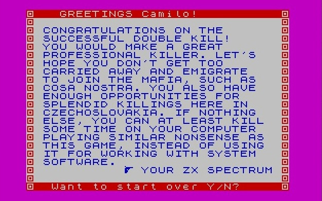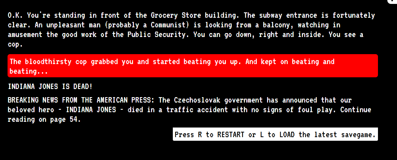 Los videojuegos Checoslovacos que pude jugar gracias al proyecto que los tradujo al inglés, pertenecían todos a esta categoría. Tiene sentido por varias razones. En primer lugar porque podemos pensar que la ideología comunista es un discurso altamente crítico; pero estos juegos también contenían críticas al propio sistema del país en que fueron desarrollados. La cuestión es que estos videojuegos eran patrimonio clandestino de una juventud disconforme con el gobierno, por lo que los utilizaban a modo de expresión. En su totalidad se trata de videojuegos de texto, muy similares a libros (uno de ellos es una alternativa a “La dama de Monserau” de Alexander Dumas). La figura de “la mafia” es recurrente, Estados Unidos aparece como un país que exporta drogas o dónde la gente se intenta robar, ya sea dinero o la fórmula de la pepsi (todas las aventuras en EEUU implicaban robos), y Checoslovaquia es un país en el que un policía puede asesinar a Indiana Jones y el diario dirá que murió en un accidente.